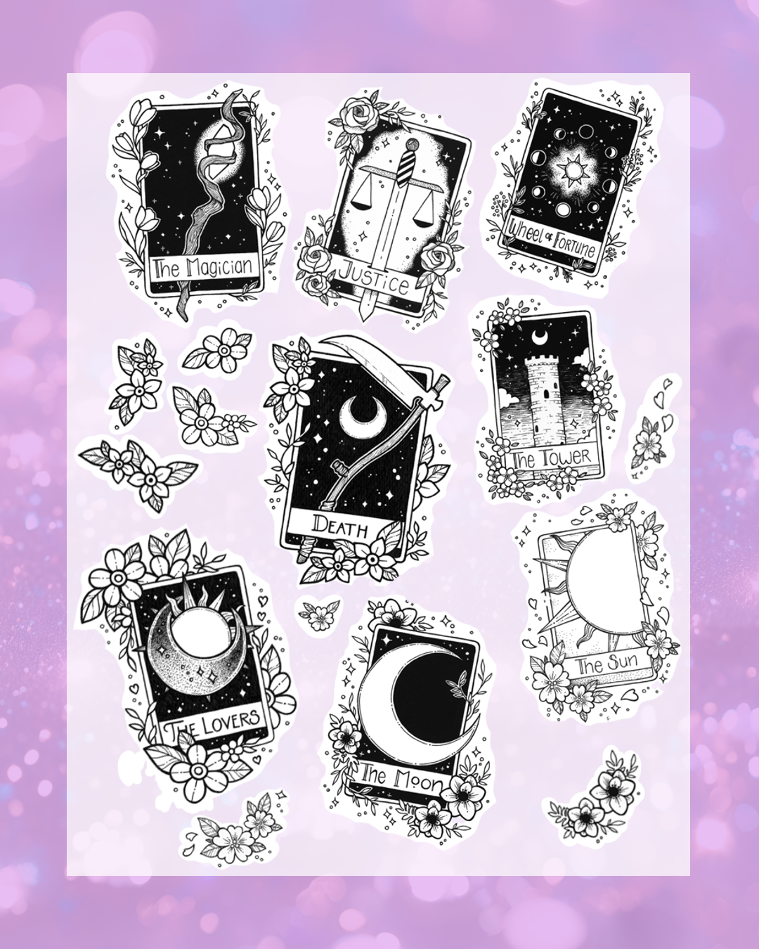 Pack de 15 autocollants. Le plus grand, la carte de tarot "Death", fait environ 7cm de hauteur.